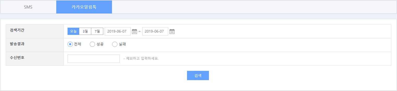 - 회원에게 발송된 카카오톡 메시지 내역을 기간, 전송결과, 수신번호로 조회할 수 있습니다.