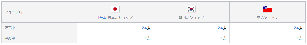 現在運営しているショップごとに販売表示されている商品の数量が表示されます。