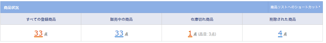 ショップに登録されたすべての商品、販売中の商品、在庫切れ商品を確認することができます。