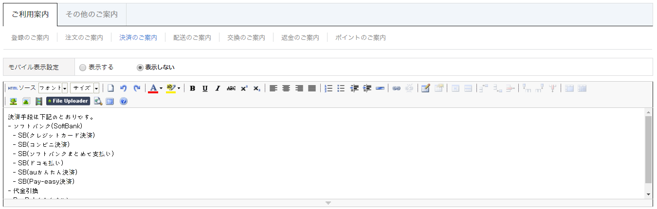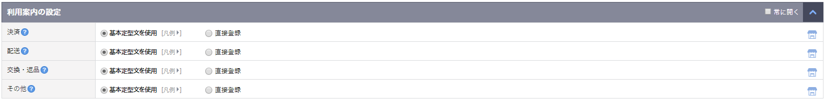 - [ショップ管理>基本情報設定>ご利用ガイドの設定>決済ガイド]に入力したコンテンツを、該当の商品に表示します。