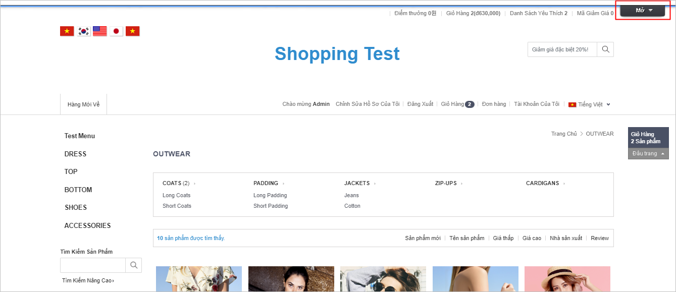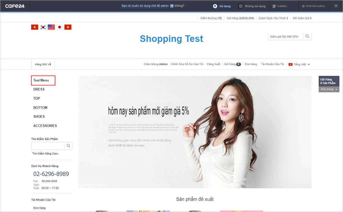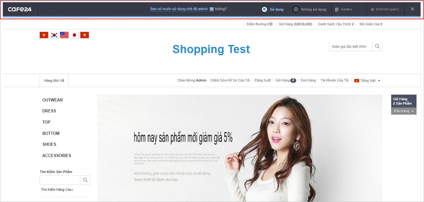 Với tính năng này, admin có thể trực tiếp xem và quản lý giao diện trang mua sắm. Sau khi đăng nhập trang mua sắm bằng tài khoản admin, thanh Chế độ admin sẽ hiển thị phía trên.
