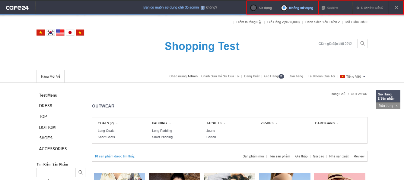 Không sử dụng Chế độ admin. Hiển thị giao diện trang mua sắm cơ bản.